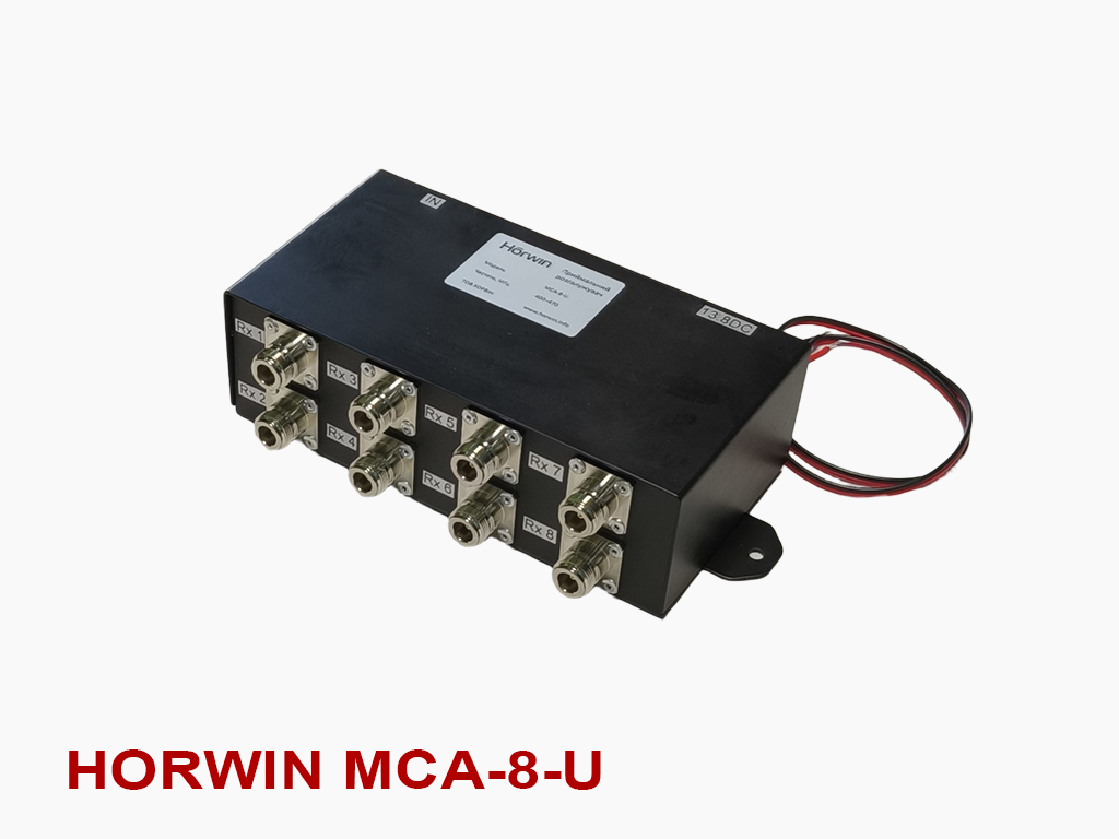 HORWIN MСА-8-U is an active distribution panel used in multi-channel radio communication systems to connect several receivers to one common antenna. The switchboard includes a compensating low-noise amplifier and an 8-channel signal divider.